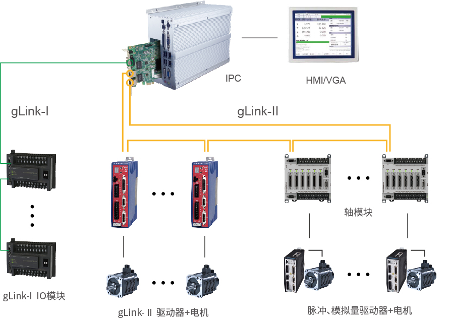 GSN系列高性能多轴网络运动控制器是一款网络型、模块化的插卡式运动控制器。控制器主卡实现运动控制计算,它通过gLink-II 总线连接固高自主开发的gLink-II 驱动器和轴控模块,客户可以根据自身需求,选择gLink-II 驱动器或不同类型的轴控模块(4轴模块、6轴模块),快速搭建高性能运动控制系统,实现分布式现场运动控制和控制系统柔性化。